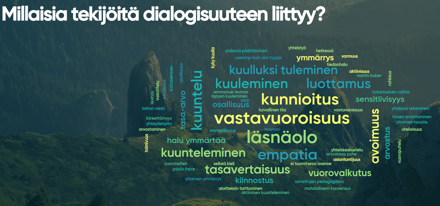 Syksyn 2019 täydennyskoulutuksessa käsiteltiin dialogisuutta osana vaativaa erityistä tukea. Kullakin koulutuspaikkakunnalla osallistujat pääsivät luomaan sanapilven DIALOGISUUDESTA. Millaisia sanoja dialogisuus herätti? Sanapilveä tarkasteltiin uudestaan koulutuspäivän lopuksi ja sitä sai täydentää. Alla voit tarkastella eri paikkakuntien sanapilviä päivän lopuksi: